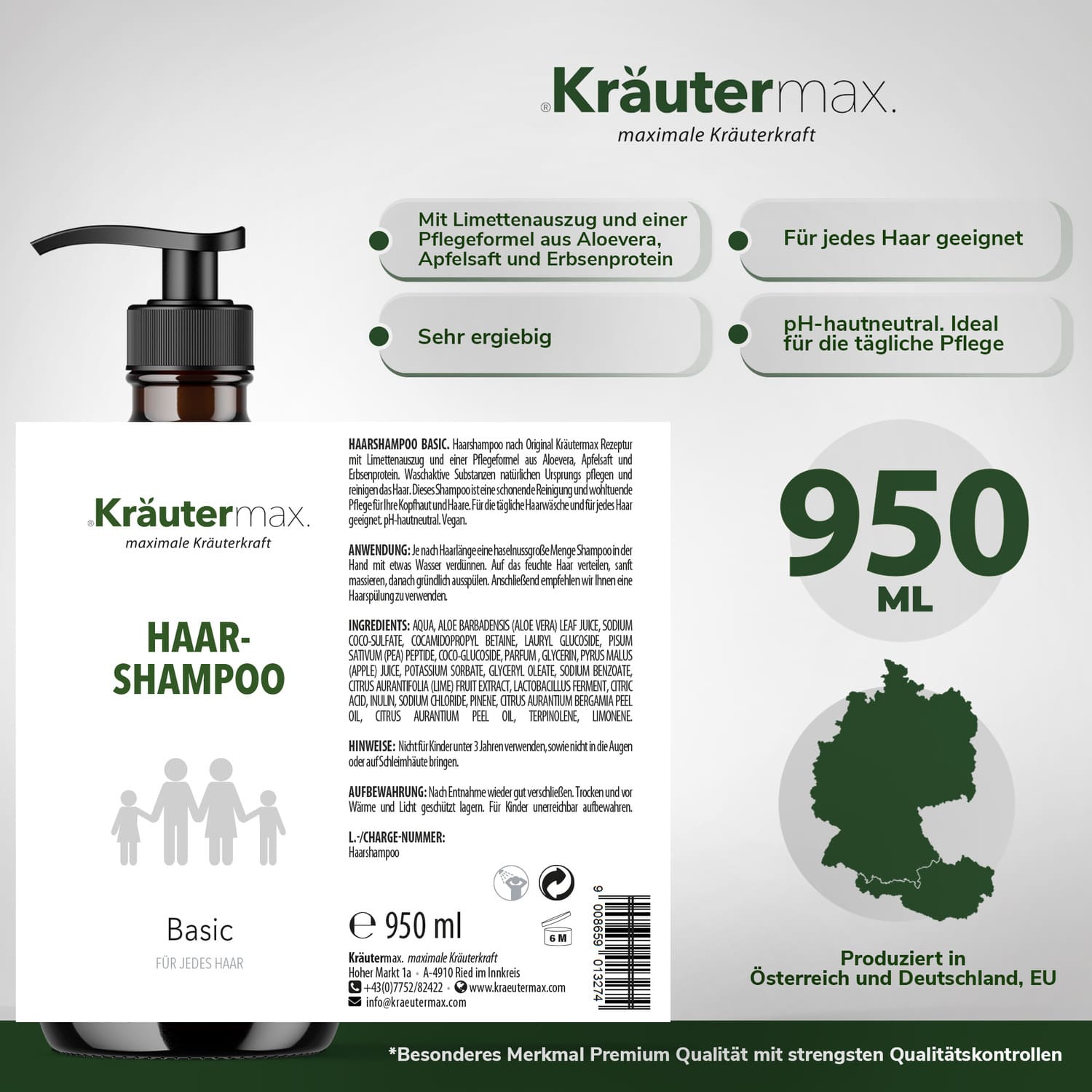 Haarshampoo Basic. Haarshampoo nach Original Kräutermax Rezeptur mit Limettenauszug und einer Pflegeformel aus Aloevera, Apfelsaft und Erbsenprotein.