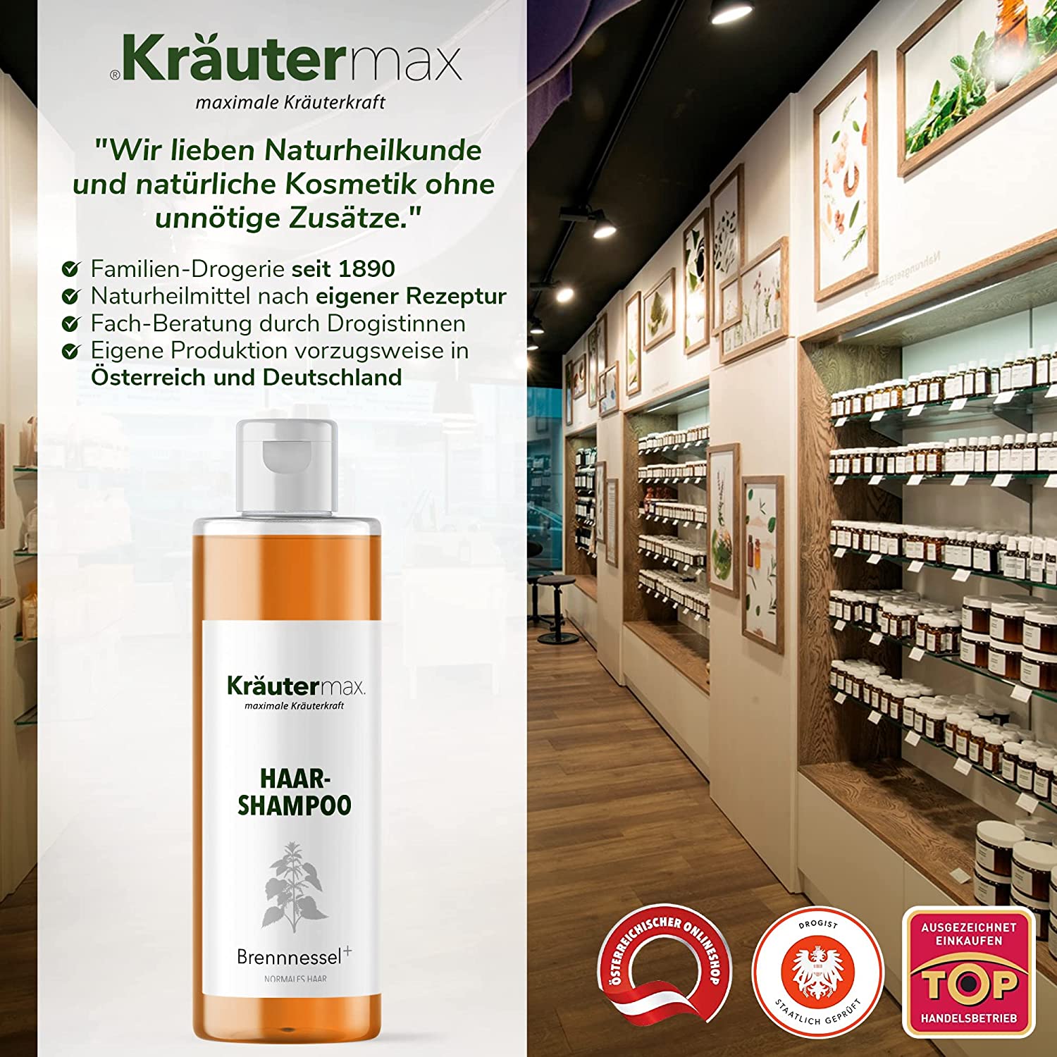 Haarshampoo Brennnessel plus. Haarshampoo nach Original Kräutermax Rezeptur mit Extrakten aus Brennnessel, Hopfen und Meersalz.